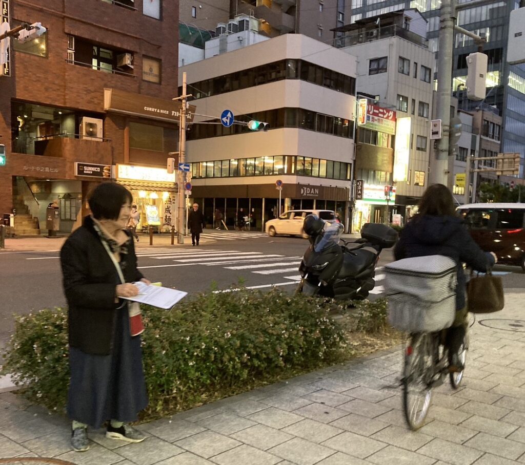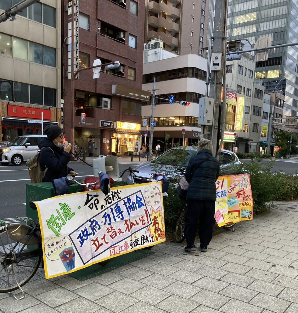 報告12月15日4時半から5時半、中央区の会は今年最後の街宣をいつもの天満橋ではなくスーパーライフ天神橋前で行いました。スーパーライフ前の為、天満橋よりは通る方は少なかったのですが、チラシの方は50枚くらいですが取ってくれました。