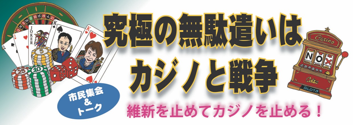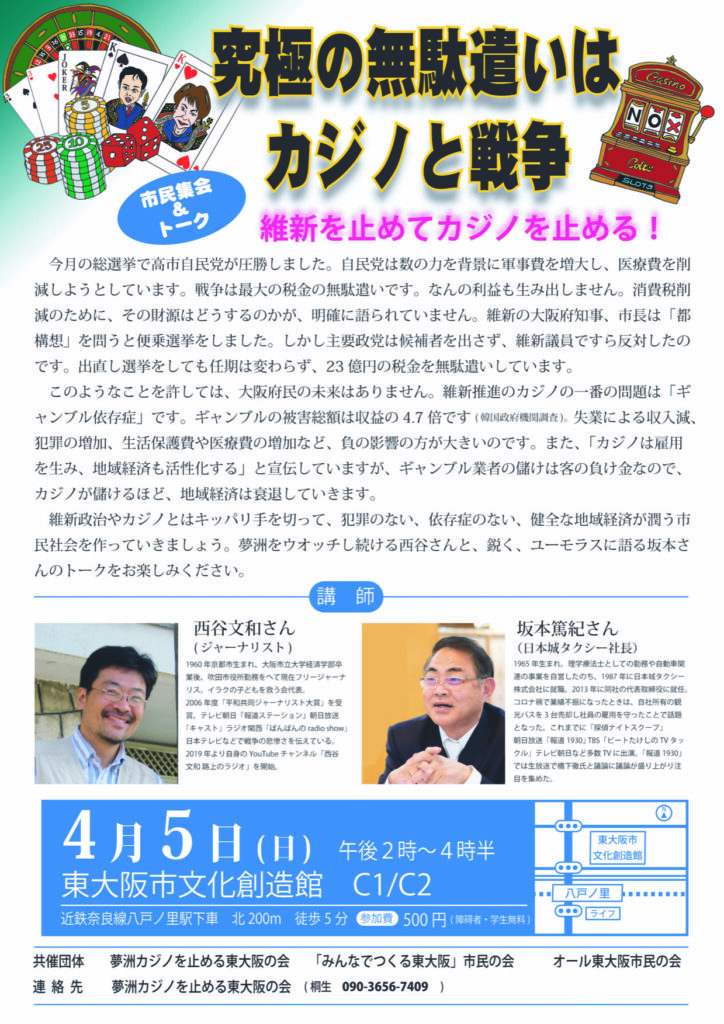 市民集会とトーク(東大阪)4月5日(日) 行動予定 X Facebook はてブ LINE コピー 2026.04.04 究極の無駄遣いはカジノと戦争ー維新を止めてカジノを止める!ー 4月5日(日)14時~16時30分 東大阪市文化創造館 C1室C2室 詳しい内容はチラシをご覧ください