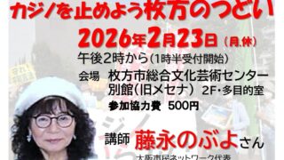 日時:2月23日(月・休) 14:00~ (受付13:30)場所:枚方市総合文化芸術センター別館(旧メセナ) 2F・多目的室参加協力費 500円講師:藤永のぶよさん(大阪市民ネットワーク)主催:夢洲カジノを止めるひらかたの会連絡先: 井筒百...